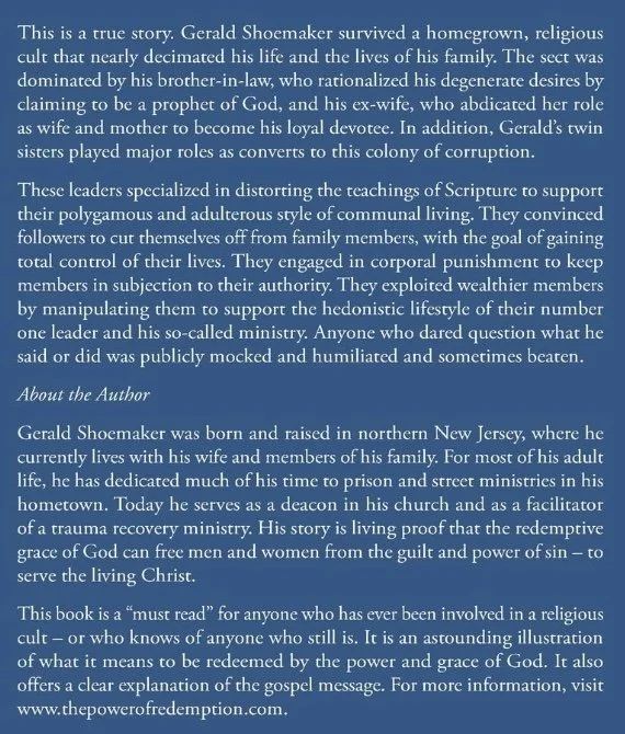 Gerald Shoemaker’s Book Release The Power of Redemption BUY ON AMAZON This is a MUST READ testimony of Gerald Shoemaker, mentioned in Power of Truth. Read about the powerful testimony of the Shoemaker family who overcame the wickedness of Daddy Leviathan and Shirley’s manipulation and corruption.